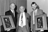 Christopher Harman, who retired as an Associate Professor at the University of Southern Queensland, Toowoomba, was a member of the AMC Problems Committee for 27 years. He is shown left receiving his BH Neumann Award from Professor Neumann with colleague Ash Plank at a function at the University of Southern Queensland, Toowoomba, June 1993.