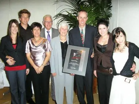 Russell with, from left daughter Becky, son-in-law Daniel, wife Marion, father Bill, mother Betty, and daughters Leisl and Tarryn.
