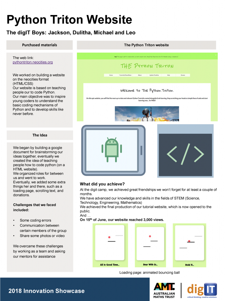 Previous digIT Projects View our students' projects from previous digIT programs During the course of the digIT program, students are given the opportunity to create and develop their own ICT projects. Below are examples from previous students.